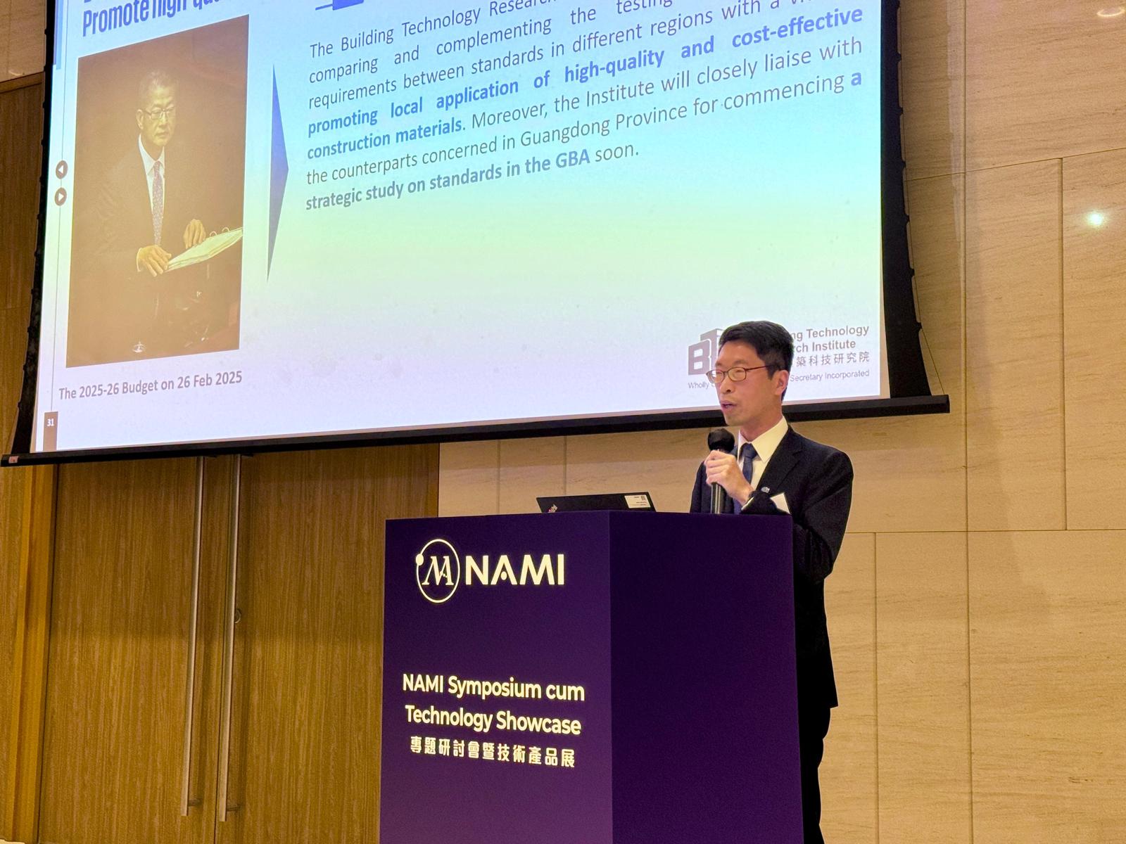 On 15 September 2025, The Building Technology Research Institute (BTRi) was invited to attend a Symposium hosted by the Nano and Advanced Materials Institute (NAMI). Ar Fong Chi-hang, Colin, Section Head of BTRi, was invited to deliver a keynote presentation titled " Building the Future: How BTRi Drives Innovation in Construction Materials". The presentation highlighted BTRi's core mission and work directions, as well as BTRI’s strategies to tackle the challenges in the construction industry through innovation in construction materials.
