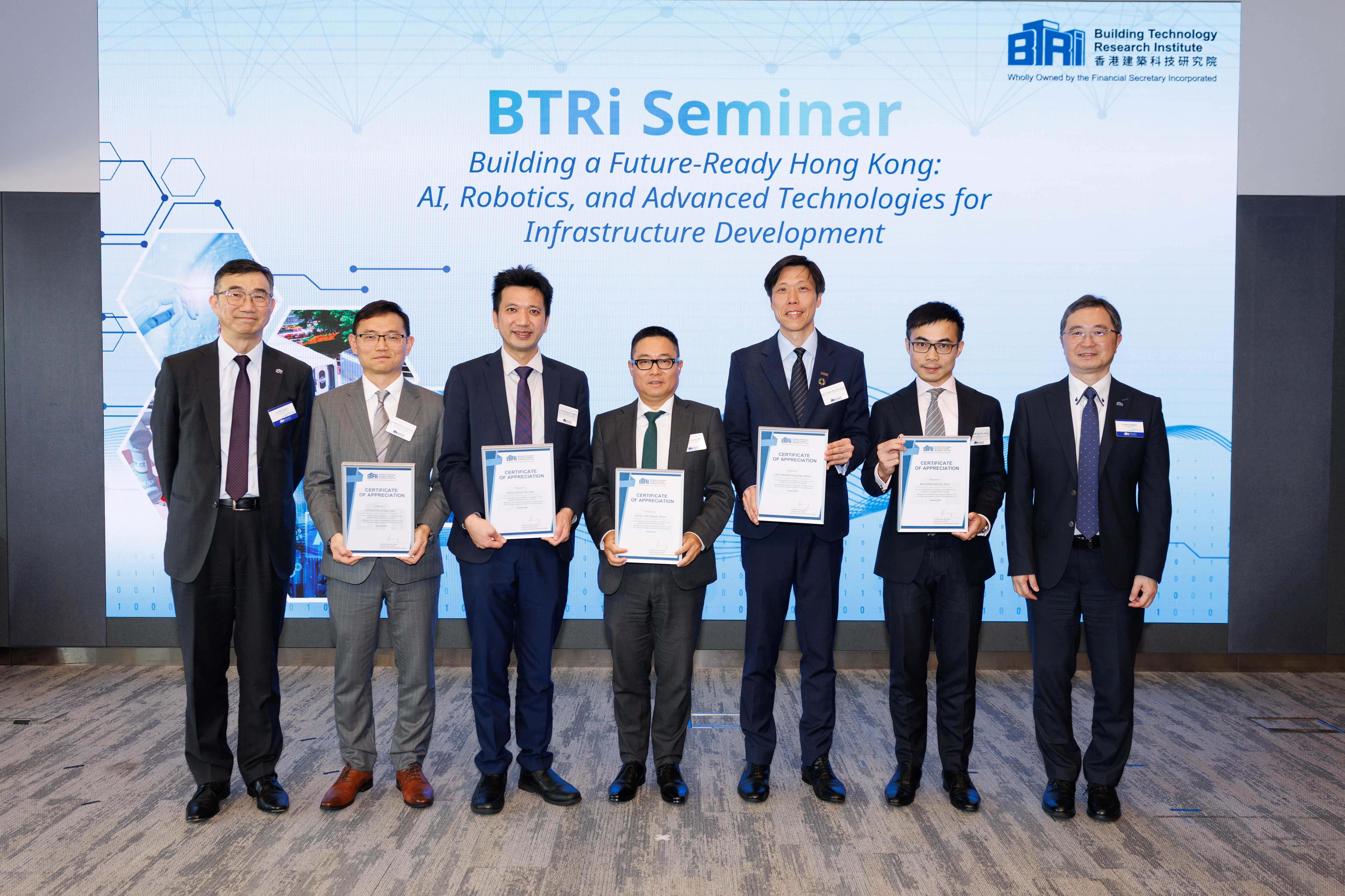Ir LEE Tai On, Section Head (Applied Research and Development), BTRi (First left); Mr POON Hiu Tung, Felix, Chief Assistant Secretary (Works) 1, Project Strategy and Governance Office, Development Bureau (DEVB) (Second left); Mr LAI Chun Fai, Alex, Chief Engineer (Digitalisation & Technology), Electrical and Mechanical Services Department (Third left); Prof LU Wilson WS, Chair Professor (Digital Construction) and Head, Department of Real Estate and Construction, Faculty of Architecture, The University of Hong Kong (Middle); Ir Dr CHONG Wang Hei, Bruce, Fellow and Director, Climate & Sustainability Group, Arup (Third right); Mr Alvis KONG, Partner, Strategy and Economic Advisory, Deloitte China (Second right), Ir Wong Kwok Fai, Alfred, CEO of BTRi (First right).