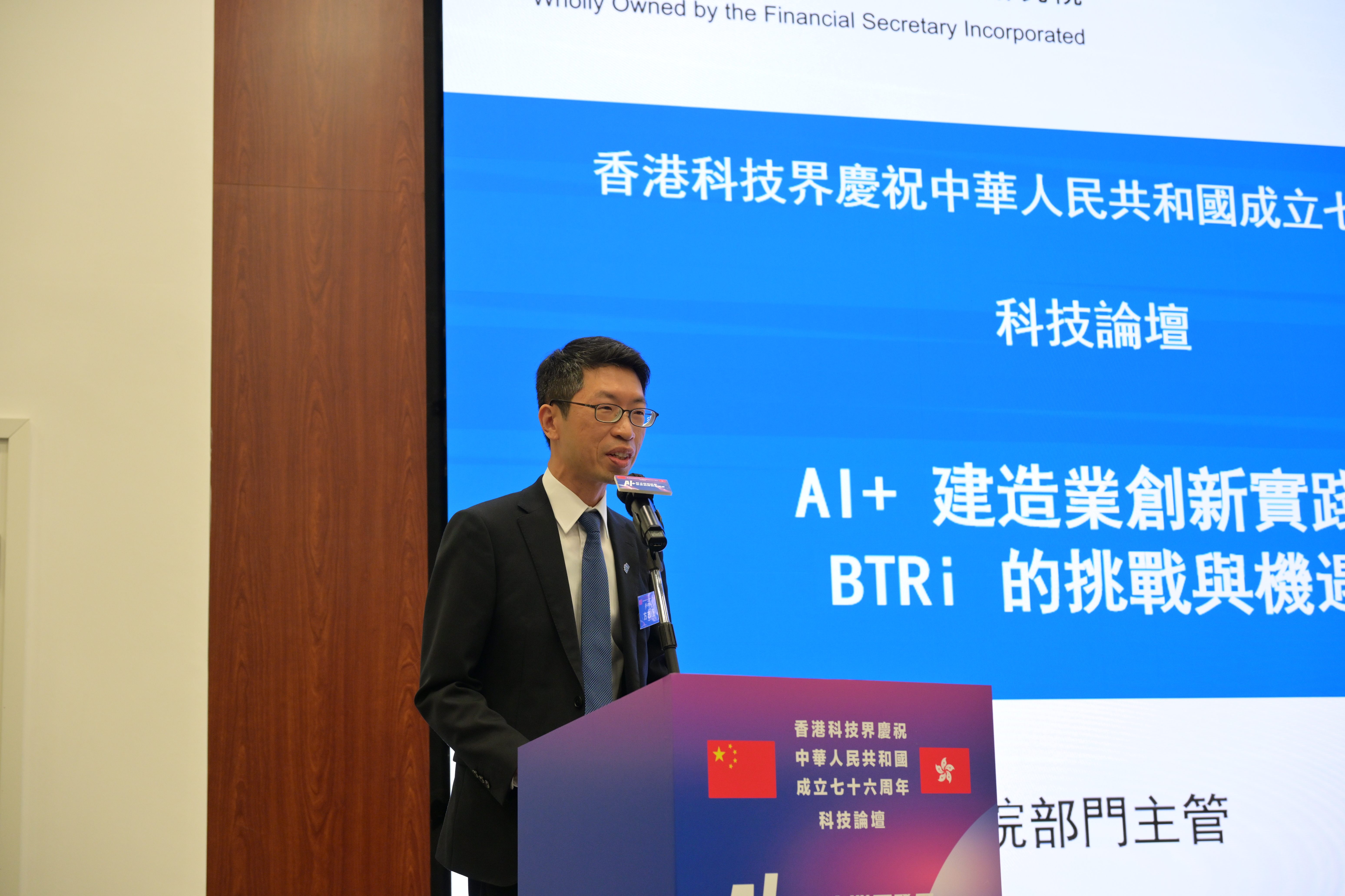 香港建築科技研究院(香港建科院)於九月十二日應邀出席香港科技界慶祝國慶籌委會舉辦之科技論壇。香港建科院部門主管方志恆建築師應邀成為主講嘉賓,以「 AI+ 建造業創新實踐: BTRi 的挑戰與機遇」為題發表專題演講,分享 AI+ 在建造業應用的見解。